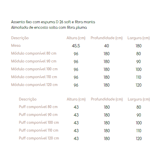 - Mesa + 2 módulos componíveis de 100 cm + 1 Puff 100 cm.