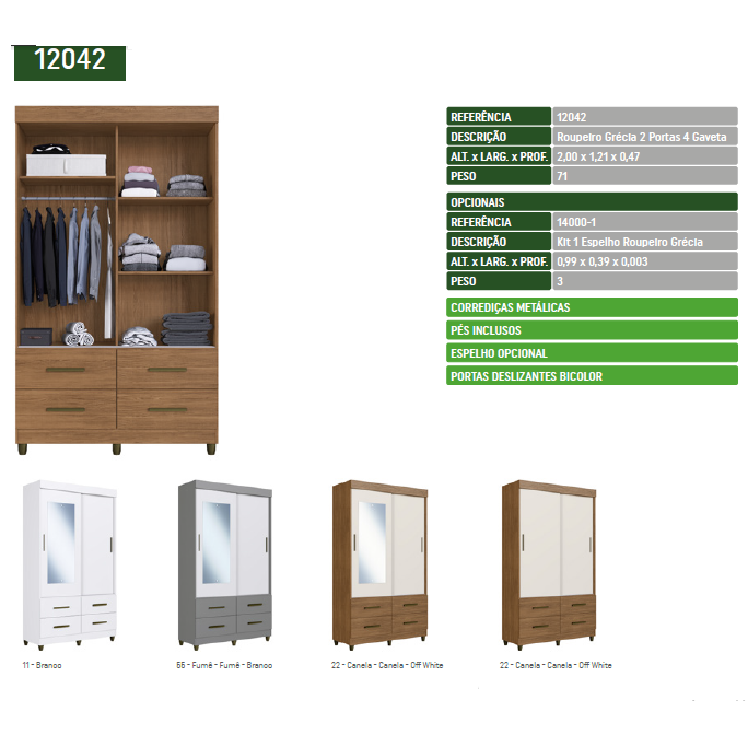 Roupeiro Grécia 2 Portas 4 Gavetas 121 | 12042 | Faimec Móveis