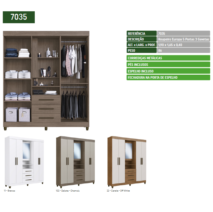Roupeiro Europa 5 Portas 3 Gavetas 165 | 7035 | Faimec Móveis